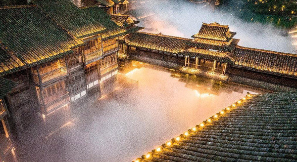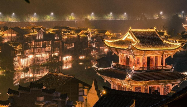 夜幕漸沉,華燈初上,當第一盞街燈亮起,霧色輕拂,溢彩如畫,真是暖風熏得游人醉,星燈連天映。在廊橋遠眺,閣樓處華燈璀璨,瑰麗奇特,千家燈火層層疊疊,錯落有致。微風拂過,水中的點點星火隨波搖曳,若隱若現,似一處人間仙境。