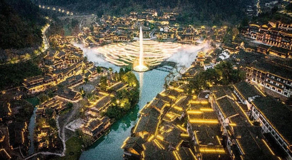 除了奇絕夜景,還有精彩表演將入夜后的氣氛推至高潮。夜幕降臨,悠揚的黔北民族音樂中,連綿梯田上跳躍著五彩燈光。音樂的節奏交響,簇簇水柱隨之舞動,如畫的水景,如夢如幻的光影,讓人念念不忘。