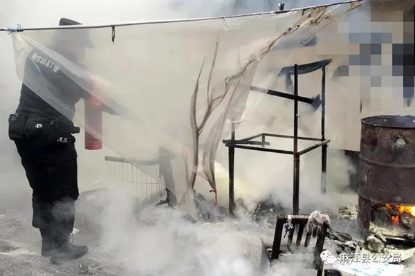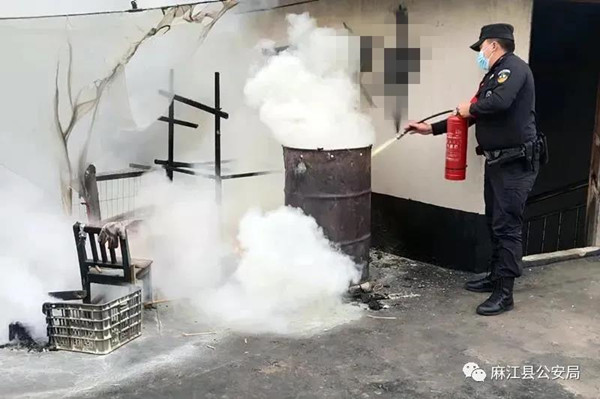 1月13日傍晚5點半,縣公安局特巡警大隊辦公樓后面一棟大樓頂上冒出濃煙,值班民警發現異常后馬上警覺起來,初步判斷應該是熏臘肉失火了,趕緊通知在家的和巡邏的隊員迅速趕到,果然是熏臘肉著火,因火上澆油,主人離開,現場濃煙滾滾、火勢很大,若不及時撲救還會引起建筑物燃燒起來。顧不得多想,特警隊員不顧危險和氣溫滾燙,堅持靠近撲救,隨后滅火器送到,才將大火撲滅,整個滅火過程只用了十幾分鐘,為有效切斷火源搶占了有效撲救機會,避免了一場大火的發生。