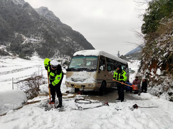 2月23日,氣溫回升,民警再次聯系事故當事人準備對其車輛實施救援。雖然國省道上的積雪開始消融,但牛鴉山村道上仍然有大量積雪,參與救援的民輔警經過約30分鐘的徒步,帶著工具艱難地走了三公里“雪路”后終于趕到現場,對事故車輛開始實施救援。經過3小時的全力施救,終于將車輛拉回車道,但由于該路段積雪較厚依然不具備通行條件,就指令駕駛人將車停靠在安全路段,待積雪進一步融化后再出發。當事人表示十分感謝麻江公安交警的積極救援,他們將繼續在村民家休息等待天氣進一步好轉,再視路面情況謹慎出行。