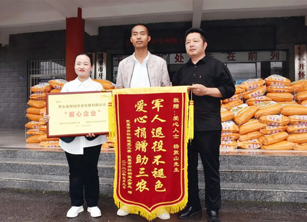 當(dāng)天上午,愛心人士楊敦山在采購?fù)暌慌r(nóng)用復(fù)合肥后,立即驅(qū)車帶領(lǐng)滿載復(fù)合肥的貨車趕到凱里市開懷街道辦事處。卸貨時,因為擔(dān)心下雨,不能堆放在露天的場地,于是楊敦山與在場的黨員干部一起,將貨車上160袋共8000斤復(fù)合肥一一搬下車,并整齊地擺放著街道辦公樓大門口。隨后,開懷街道黨政負(fù)責(zé)同志為楊敦山贈送了“軍人退役不褪色,愛心捐贈助三農(nóng)”金色字樣的錦旗和授予“黔東南景園農(nóng)業(yè)發(fā)展有限公司‘愛心企業(yè)’”的金色牌匾,以此表示真誠的感謝。