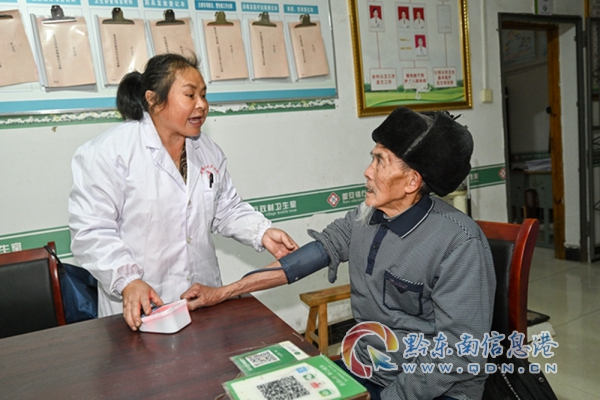 劉征秀(左)在村衛生室為村民檢查身體