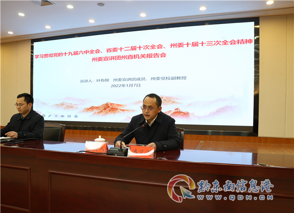 本網訊 根據州委統一安排,1月7日上午,州直機關工委組織召開學習貫徹黨的十九屆六中全會、省委十二屆十次全會、州委十屆十三次全會精神州委宣講團州直機關報告會。州委宣講團成員、州委黨校教務處處長、副教授葉有根作宣講報告,州直機關工委委員、紀檢監察工委書記潘義飛主持報告會。