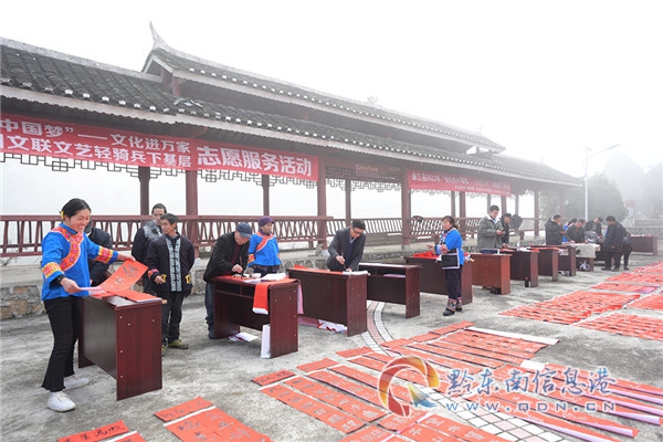 每年春節前,是黔東南州各地文藝家開展文藝惠民、展現才藝活動的大忙季節,也是老百姓熱切期盼歡迎他們的特殊時期,因為幾乎家家戶戶都要忙著張羅年貨、打掃房前屋后、迎接新年,貼春聯貼福字是一件必不可少的大事,書法家、攝影家們特別的忙,進社區、進軍營、進農村為群眾寫春聯、寫福字、拍全家福……將新春祝福和傳統文化帶進千家萬戶。