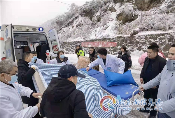 2月2日,鎮遠縣江古鎮一傷者生命危急,急需救治。當時大雪封山,車輛無法通行。交警、衛生院工作人員、熱心群眾等多方迅速組成徒步救援隊,齊心協力將傷者送至前來接應的120救護車上,贏得了寶貴時間。