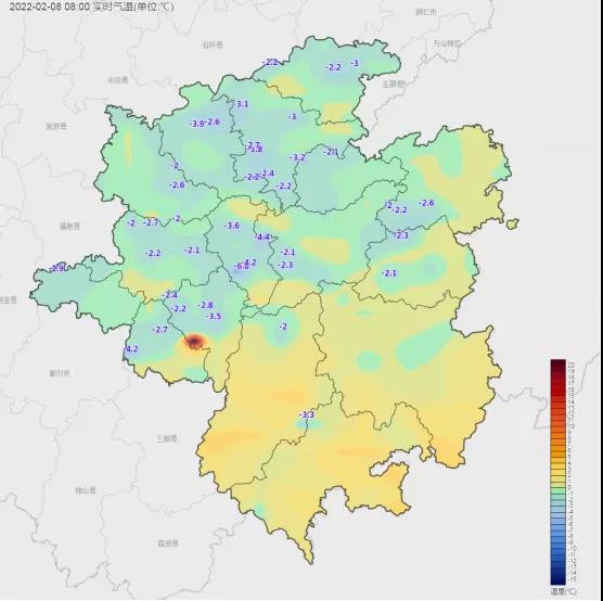 據氣象監測:7日20時至8日8時州南部河谷低洼地區陰天有小雨,其余地區小雨轉雨夾雪或凍雨,地勢高處有小雪,部分路段有雨霧,高海拔地區部分路段有道路結冰,城區三穗、劍河、麻江、凱里、岑鞏有微量電線積冰,劍河有微量積雪;8時16縣(市)城區氣溫-1.6℃(丹寨)~3.6℃(榕江),凱里-0.3℃,全州有184站點氣溫降至0℃以下,臺江萬畝草場-6.8℃最低,鄉鎮最低臺江方召-4.4℃,施秉馬溪-3.9℃次之。