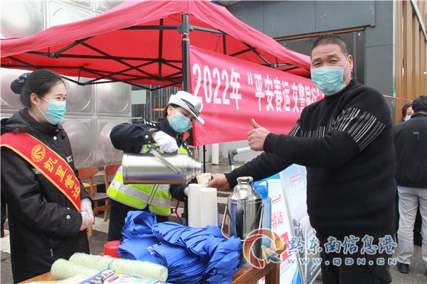 1月17日春運啟動日,滬昆高速三棵樹服務(wù)區(qū)。一位年輕司機走到春運“愛心驛站”攤點前,對黔東南州公安局交警支隊高速一大隊民警龍明慧說:“交警同志,您這有熱水嗎?”龍明慧連忙回答:“有,請您把水杯給我。”很快,龍明慧就給司機水杯倒?jié)M水。司機連忙道謝:“真是太感謝了!”“不客氣,為司乘朋友提供力所能及的幫助是我們應(yīng)該做的。”龍明慧回答。