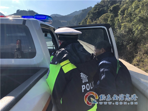 當(dāng)天,黔東南州公安局交警支隊高速六大隊民警巡邏至劍榕高速水尾段時,發(fā)現(xiàn)一位步履蹣跚的老人獨自在高速上行走,過往的車輛在老人身邊擦肩而過,情況十分危險。民警立即靠邊停車,詢問老人的情況。據(jù)了解,老人是附近的村民,因兒女都在外,家中無人,而且自己又沒有手機和其他能聯(lián)系上家人的方法。最近自己腿腳十分疼痛,想抄近路去附近的醫(yī)院就醫(yī),迫不得已獨自走上了高速。