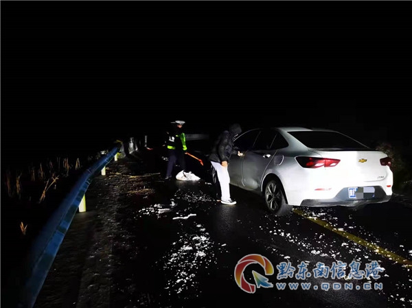 2月7日18時55分,雷山縣公安局交警大隊值班民警接警稱:在距離縣城20多公里的望豐鄉(xiāng)望豐河有一輛越野車駛?cè)牒又校颖焕А?/p>