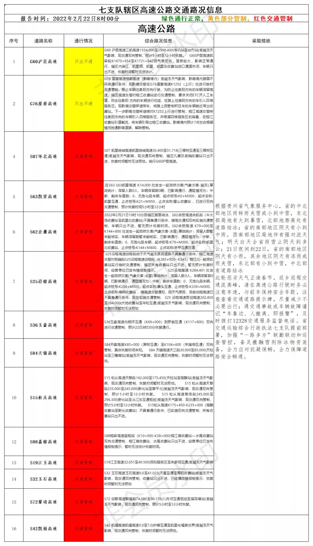 2月22日07時00分黔東南州道路凝凍臨時交通管制情況 :