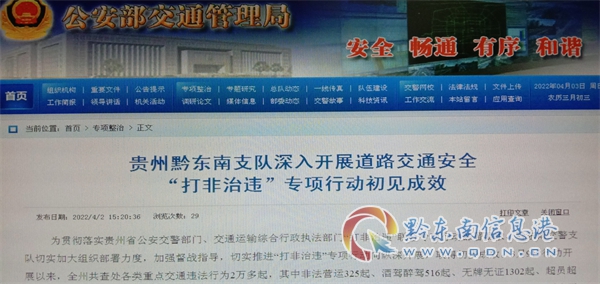 本網訊 4月2日,公安部交通管理局網站采用黔東南州公安局交警支隊工作簡報《貴州黔東南支隊深入開展道路交通安全‘打非治違’專項行動初見成效》,點贊黔東南州公安局交警支隊在開展道路交通安全‘打非治違’專項行動中推行的“邊督邊戰”新舉措。