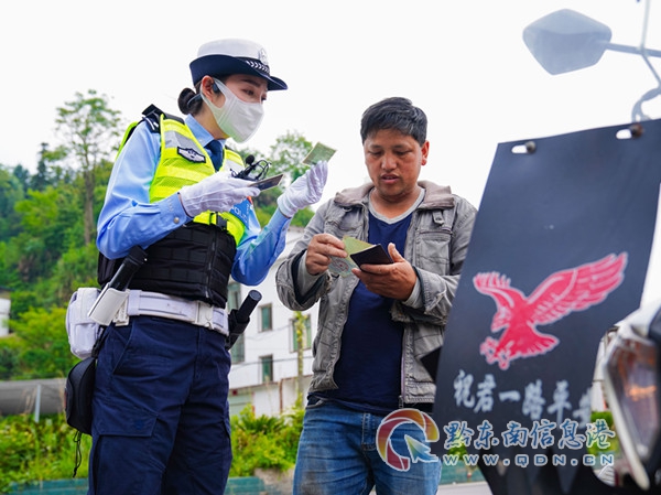 5月6日,“美麗鄉村行”交通安全巡回宣傳活動在凱里“4.6”道路交通事故發生地龍場鎮虎莊舉行。期間,交警通過采取發放宣傳資料、面對面講解等多種宣講方式,廣泛向群眾宣講如何安全駕車、如何安全乘車、如何正確系安全帶、佩戴安全頭盔、在不同道路環境下如何避免交通事故的發生及酒駕、醉駕、超速行駛、不按規定車道行駛、三輪車違法載人、面包車超員等交通違法行為的危害。同時,交警結合凱里“4.6”交通事故案例,用“身邊事”警醒“身邊人”,運用苗、漢語結合告知廣大群眾交通陋習、交通違法行為的危害性和遵守交通法規的重要性,要求群眾從中吸取教訓,敲響安全警鐘。