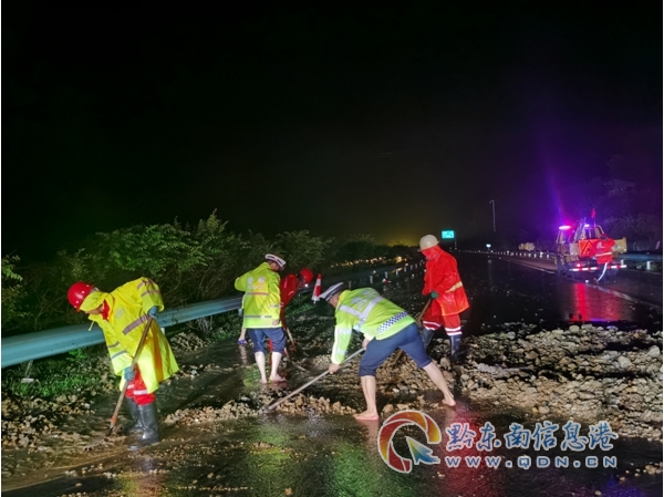 巡邏民警李興隆帶領(lǐng)輔警瞿裕琨、姚茂良巡邏至滬昆高速劍河往三穗方向1613公里+100米處時,發(fā)現(xiàn)應(yīng)急車道、行車道和超車道上散落有大小不一的石塊,應(yīng)急車道邊上洪水從跌水槽傾瀉而下并沖入路面,路面積水嚴重,路面散落的石塊如不及時清理將威脅道路行車安全,極易引發(fā)事故。