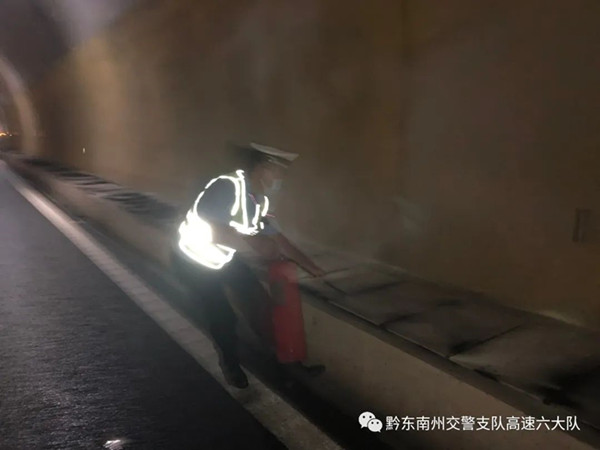 上午8時40分許,黔東南州公安局交警支隊高速六大隊一中隊值班室接大隊轉警,稱S88荔榕高速上行線24km+300m(擺加隧道)處起火,因起火導致隧道里面煙霧彌漫,嚴重影響高速行車安全及隧道照明設備,存在極大的安全隱患。警情就是命令,中隊值班民警接到警情后,第一時間向中隊帶班領導匯報,立即啟動應急預案,并第一時間火速趕往現場,同時通知“一路多方”各部門前往支援。