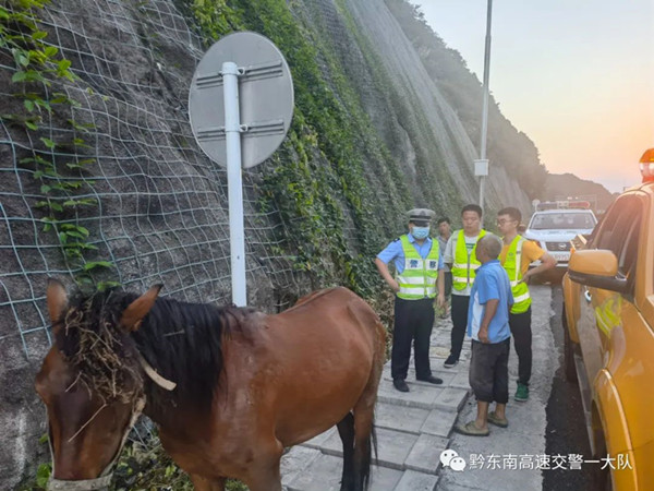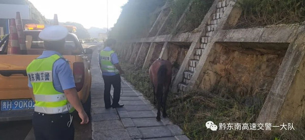 2022年07月04日17時50分許,黔東南州交警支隊高速一大隊值班室接到過往駕駛員報警稱在滬昆高速(下司往麻江方向)1708公里處,有一匹馬在高速公路上“散步”,嚴重影響到后方行車安全。