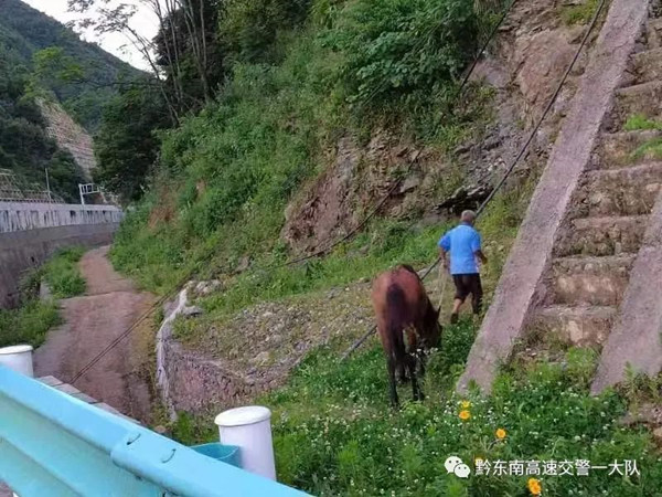 為了防止馬匹受驚后,在高速公路上狂奔,現場民警迅速關掉警燈、警笛,在遠端設置警戒區,指揮后方來車減速避讓。并聯合一同到達現場的高速應急部門工作人員,慢慢接近馬匹,并成功將其控制住后牽到應急車道內,拴在路邊的欄桿上,防止馬匹再次走上高速公路。雖然過程有驚無險,但稍微處理不當,馬匹受到驚嚇后,沿著車流量較大的滬昆高速奔跑起來,后果不堪設想。隨后,民警聯系轄區派出所尋找馬主人,最后在當地村干的幫助下,民警成功聯系上了馬主人。據馬主人介紹,當天下午他將馬匹拴在高速公路附近的草地上,不知什么原因拴馬的韁繩脫落,也不知馬匹是從哪個地方上到了高速公路“散步”。