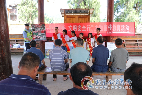 宣傳民警結合“美麗鄉村行”宣傳主題,到村寨集合留守兒童和老人,以“壩壩會”的形式,讓學生向在場人員宣傳交通安全知識,發放交通安全宣傳單、講解事故案例展板,重點講解行人不能違法進入高速公路、破壞公路設施、如何安全通過馬路、騎乘車輛需佩戴安全頭盔等交通安全知識。