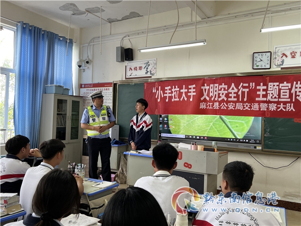 民警從日常的上放學路上講起,要求同學們在過馬路時要做到“一慢二看三通過”,不準在道路上扒車、追車,不要追逐打鬧。同時還從“如何安全過馬路”、“乘車須知”、“一盔一帶”、“酒駕危害性”等方面的常識進行了通俗易懂的講解。并結合轄區真實案例,向師生講解交通安全法律法規和交通安全基本常識,教育學生如何辨別和拒絕乘坐非法營運和超員車輛,避免發生交通事故。提醒學生們日常出行不僅要遵守交規,還要增強自身防范意識,堅決抵制不文明交通行為。民警還通過一問一答與同學們現場互動,讓同學們有參與感、體驗感,使交通安全知識入腦入心。此外,選出1名學生代表,通過自身經歷來講述交通安全相關知識,向同學們傳授交通安全注意事項。