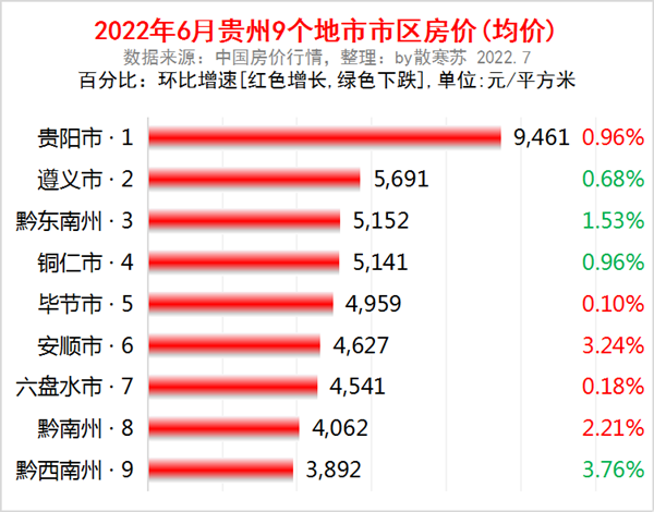 其中,環(huán)比增速最快的是安順市,相比上個月上漲3.24%。環(huán)比下跌幅度最大的是黔西南州,相比上個月下跌3.76%。