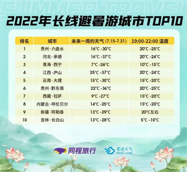 綜合墨跡天氣提供的未來一周的天氣數據和同程旅行目的地的預訂數據,貴州黔東南整體氣溫適宜,是今夏備受中長線跨省游用戶推崇的避暑勝地之一,也成為2022年長線避暑旅游城市TOP10。