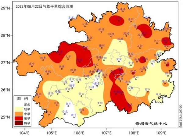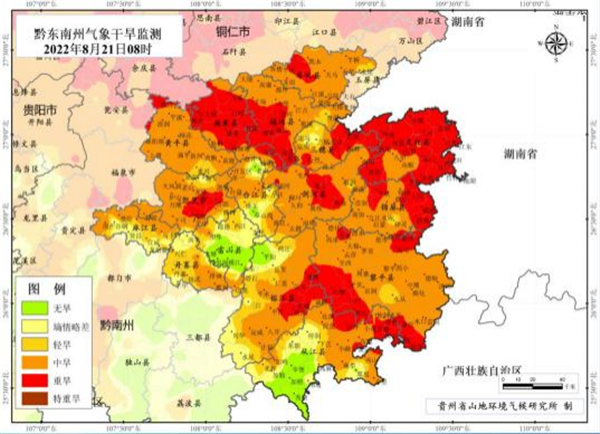 據貴州省氣象局了解,據8月22日氣象干旱綜合監測,貴州省出現重旱的有15個縣(市、區)(七星關、黔西、金沙、正安、德江、印江、碧江、天柱、鎮遠、
