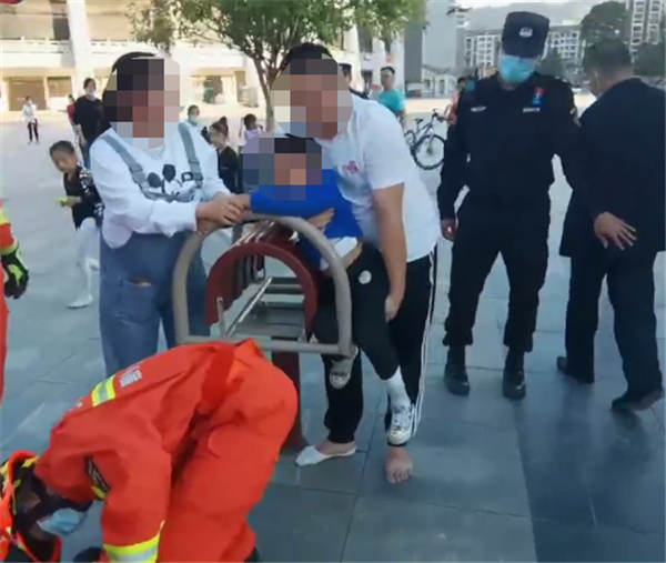 消防救援人員在其父母的幫助下一邊安撫被困男孩的情緒,一邊組裝液壓破拆工具實(shí)施救援。為防造成二次傷害,救援人員利用液壓剪擴(kuò)器等工具,從中間對卡住小孩左腳的健身器材鋼管進(jìn)行擴(kuò)張,直至兩根鋼管間的距離足夠脫困。約30秒后,小男孩被卡的左腳被取出。