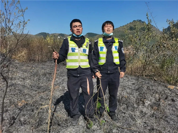 山火成功撲滅后,民警的臉早已被熏黑,衣服早已被汗水浸濕,輔警李金龍的警褲更是在撲火時被灌木叢掛破。