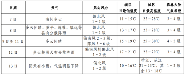 黔東南州氣象局發布本周天氣預報:預計本周我州以多云到晴天氣為主,日最高氣溫25~30℃,將出現在10日和11日,最高森林火險氣象等級4~5級,請注意森林、村寨、城鎮防火安全。13日起將出現一次降溫降雨天氣過程,榕江、從江最高氣溫降至21~23℃,其余縣(市)將降至13~18℃。降溫降雨利于秋耕秋種,同時請注意交通安全及用火用電安全,注意添衣保暖,謹防感冒。