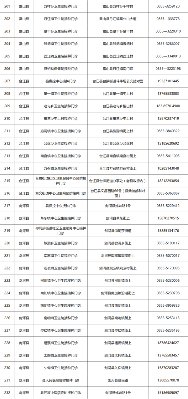 黔東南州各新冠疫苗接種門診信息如下表,建議受種者選擇就近的接種門診前往接種。