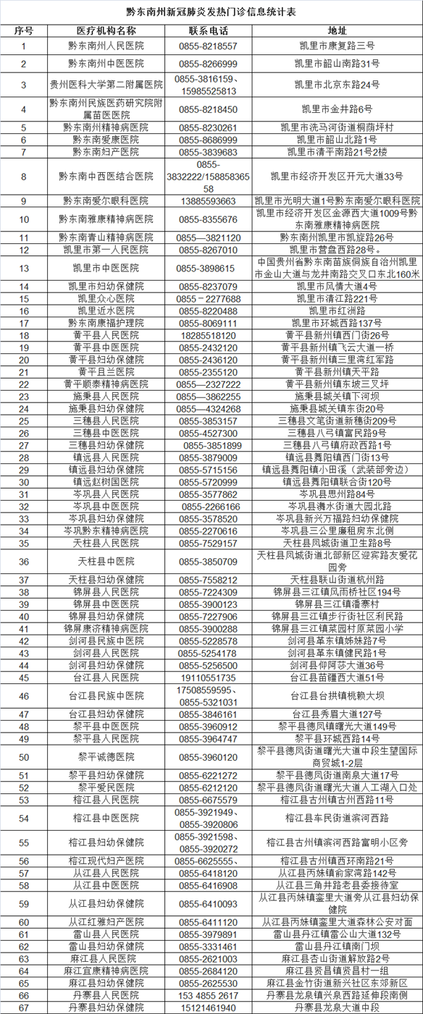 為落實國家新冠肺炎疫情防控“新十條”要求,目前,黔東南州已設置67家發熱門診(診室)(名單見附件)。