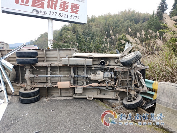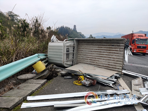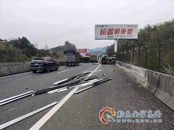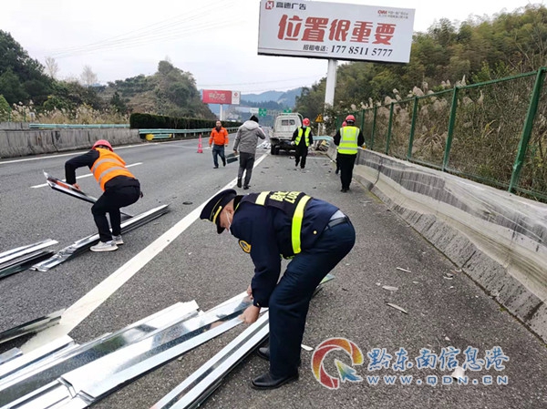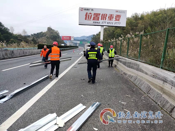 接警后交通執(zhí)法人員立即趕到事故現(xiàn)場,現(xiàn)場一片狼藉,一輛小型貨車側(cè)翻橫在行車道上,鐵皮和玻璃碎片灑滿路面,所幸駕駛員只受輕傷。“一路三方”立即展開救援,交通執(zhí)法人員勘驗損壞路產(chǎn)、應急保暢部門調(diào)來吊車對側(cè)翻的貨車進行施救,高速交警管控交通,養(yǎng)護部門清理現(xiàn)場。