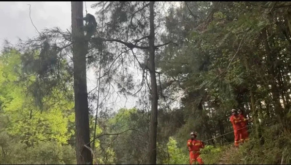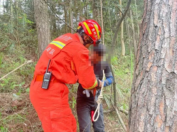 救援人員接警到場后發現,被困人員被困在樹上10米左右處,其松樹位于稻田斜坡一側,距地面高約17米。偵查地形后并迅速擬定利用“高點垂直下放”營救方案展開救援:現場指導群眾做好個人防護,并遞上一條百米大繩、全身吊帶等救援裝備,沿樹干緩慢下滑!