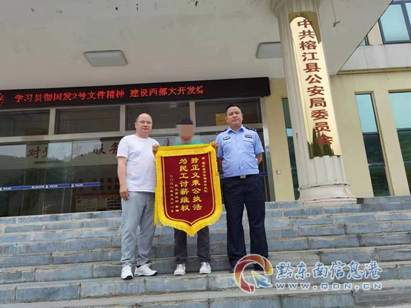 本網訊 5月11日,費某等3名民工來到榕江縣公安局治安大隊,將一面“持正義秉公執法 為民工討薪維權”的錦旗送到民警手中,由衷地感謝表達了他們對警方追回工資的感激之情。