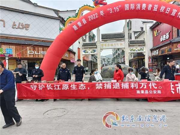 活動現場,民警通過張貼《施秉縣人民政府關于實行長江流域重點水域十年禁漁期制度的通告》、發放宣傳資料、懸掛條幅、案例展板等形式,向群眾宣傳十年禁漁相關知識和非法捕撈水產品的危害性及違法后果。
