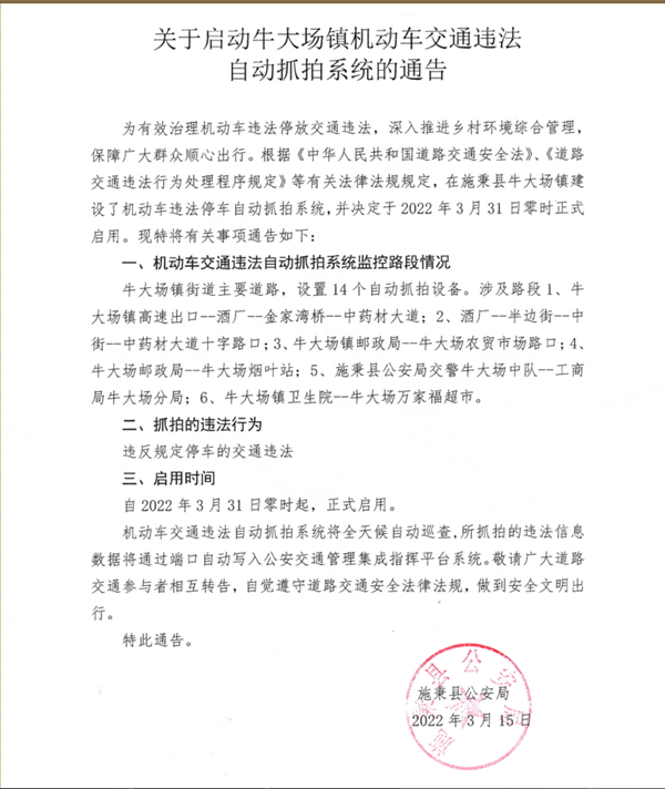 機動車交通違法自動抓拍系統將全天候自動巡查,所抓拍的違法信息數據將通過端口自動寫入公安交通管理集成指揮平臺系統。敬請廣大道路交通參與者相互轉告,自覺遵守道路交通安全法律法規,做到安全文明出行。
