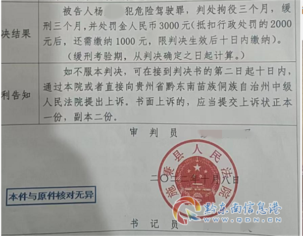 近日,駕駛人田某因犯危險駕駛罪,被施秉縣人民法院依法判處拘役三個月,并處罰金人民幣3000元。
