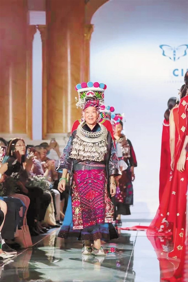 在夏華的幫助下,潘玉珍的作品開始登上展臺(tái),乃至走出國門。在這個(gè)過程中,受合作方邀請(qǐng),潘玉珍多次穿上苗繡參與走秀。