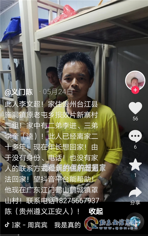 5月24日晚上,臺江縣公安局老屯派出所社區民警在抖音上看到一條視頻內容為“家住貴州臺江縣老屯鄉新寨村二組,已經離家二十多年,現在想回家,由于沒有身份證,也沒有家人的聯系方式和新的住所而無法回家,望抖音平臺能相助”。群眾利益無小事,根據抖音上的線索,民警立即與視頻發布者確認信息真實性,在確認該信息情況屬實后。為了幫助該男子找到失散的家人,助其與家人團圓。經民警查詢,確發現沒有該男子的任何信息,于是民警根據臺江縣公安局新時代社區警務“十個一”工作法,在社區服務微信群中向群眾收集線索。