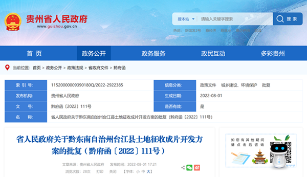 你州《關于報請批準臺江縣土地征收成片開發方案的請示》(黔東南府呈〔2022〕68號)收悉。經研究,現批復如下: