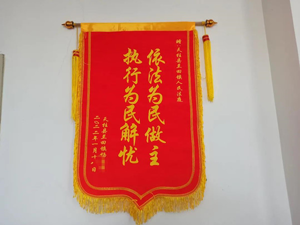 當事人楊某收到賠償款后,特意帶著一面錦旗來藍田人民法庭,感謝法官公正司法、為民解憂。恰巧法官正在開庭,另外兩名干警外出辦案,于是楊某某只能將錦旗插在門把上后離去。當外出辦案干警回來時,法官還在開庭,回來的干警準備上樓回辦公室時,發現門上多了一樣東西——一面承載著人民群眾對人民法院、人民法官認可的錦旗。(蔣順華)
