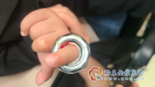 消防救援人員經過觀察發現,男孩右手食指被一只螺絲帽牢牢卡住,被卡部位因受到螺絲帽長時間壓迫,導致血液不流通出現紅腫充血癥狀,加之螺絲是雙層,外包一層鐵皮,而且鐵皮部分已經卡到肉里,小孩子還不停地哭喊,手指不停的晃動,給救援人員帶來了極大的煩惱。
