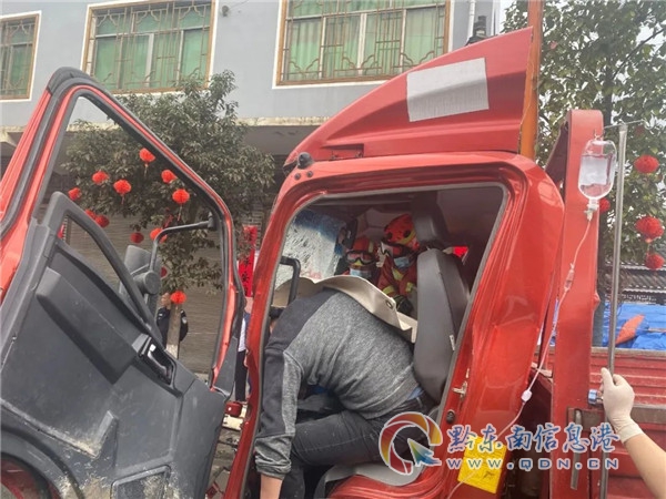 趕到救援現場時,消防救援人員看見,兩輛大車迎面撞擊后,橫停在馬路中間。據了解,送貨回程天柱途中的掛車與一輛天柱去往遠口方向貨車相撞,原本貨車、掛車均在正常行駛,貨車因發現同方向車道停有一輛皮卡車,而此時貨車正在超車,沒想到前方駛來的掛車已經來不及避讓,貨車與掛車便這樣撞上了,貨車被撞旋轉180°旋停在路中間,駕駛員的右腿被卡住,雙手嚴重撞傷不能動彈。從現場情況可以看到,因為撞擊力度太大,兩輛車的車頭都受到不小的損毀,掛車的車頭駕駛位置處大量碎片脫落,而貨車更是整個車頭完全變形,玻璃碎了一地,司機也被困在其中。