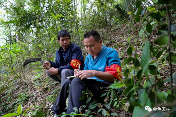 大山里草木茂密,楊代安和同事一邊查看四周的植被,一邊做好巡林記錄。