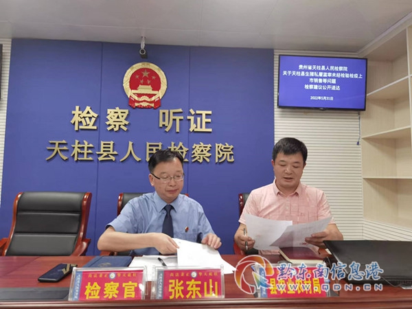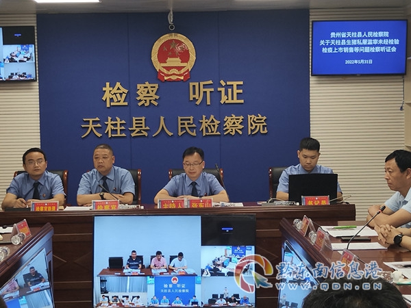 2022年5月31日,天柱縣人民檢察院召開天柱縣生豬私屠濫宰未經檢驗檢疫上市銷售等問題檢察聽證會,由天柱縣人民檢察院檢察長張東山親自主持。會議邀請了縣人大代表、縣政協委員、律師代表擔任聽證員參與評議,人民監督員對聽證會進行監督。縣農業農村局、縣市場監督管理局、縣鳳城街道辦事處、縣公安局受邀參加聽證。