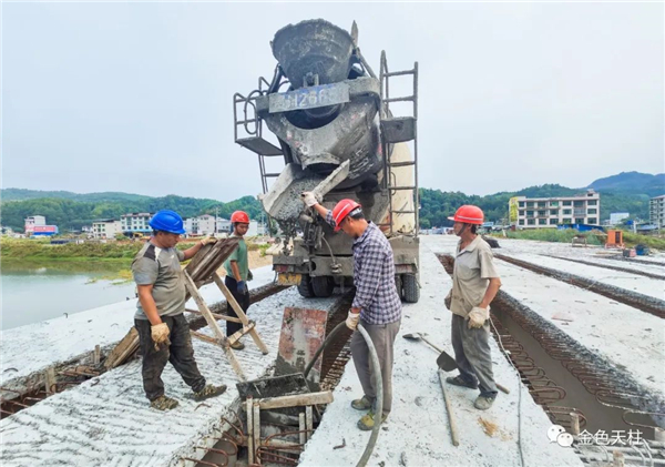在伍家橋危橋改造項目建設現場,工人正搶抓工期,忙碌澆筑橋梁的橫隔板。據悉,伍家橋為湖南省會同縣蒲穩鄉至天柱縣的重要基礎設施,橋梁橫跨鑒江河。原橋梁于2017年被評定為四類危橋。為保障兩岸安全通行,進一步完善交通基礎設施,項目于今年3月15日開工建設。