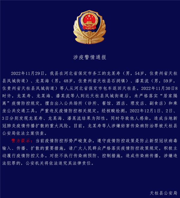 2022年11月29日,我縣在河北省保定市務(wù)工的龍某壽(男,54歲,住貴州省天柱縣鳳城街道)、龍某海(男,48歲,住貴州省天柱縣石洞鎮(zhèn))、潘某流(男,59歲,住貴州省天柱縣鳳城街道)等人從河北省保定市包車返回天柱縣。2022年11月30日8時(shí)許,龍某壽、龍某海、潘某流等人到達(dá)天柱縣鳳城街道后,未嚴(yán)格落實(shí)“居家隔離”疫情防控規(guī)定,擅自出入公共場(chǎng)所(診所、餐館、酒店、理發(fā)店、副食店)和乘坐公共交通工具,嚴(yán)重違反疫情防控相關(guān)規(guī)定。經(jīng)核酸檢測(cè),2022年12月1日、2日、3日分別發(fā)現(xiàn)龍某壽、龍某海、潘某流結(jié)果為陽(yáng)性。同時(shí)導(dǎo)致他人感染,造成當(dāng)?shù)匦鹿诜窝滓咔閭鞑U(kuò)散的重大風(fēng)險(xiǎn)。目前,龍某壽等人涉嫌妨害傳染病防治罪被天柱縣公安局依法立案?jìng)刹椤?/div>