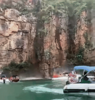 事故發生在當地時間12時30分左右。從景區其他游客拍攝的視頻中可以看到,有一大塊山石從山體上掉落,直接砸向附近湖上的游船,隨后又有多處較小石塊掉落。