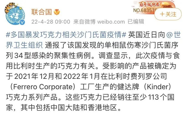 世衛組織介紹,據調查顯示,英國3月27日向該組織報告一組沙門氏菌感染病例,感染源可追溯到2021年12月和2022年1月意大利費列羅集團在比利時阿爾隆的工廠生產的Kinder巧克力系列產品。
