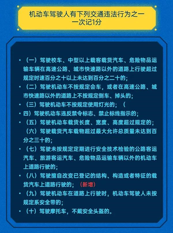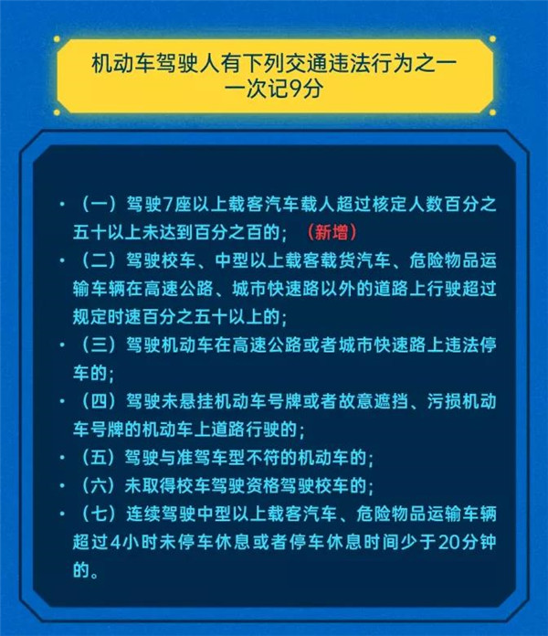公安部發布新制定的《道路交通安全違法行為記分管理辦法》(公安部第163號令)將于2022年4月1日起正式施行,2022版《辦法》在保持對酒后駕駛、交通肇事致人傷亡后逃逸、使用偽造變造牌證等嚴重妨礙交通安全的違法行為高壓態勢的前提下,根據對道路交通安全暢通影響的程度,對交通違法記分做了調整,相比“2016版”交通違法與記分,2022版記分的交通違法共50項,其中7項記12分,7項記9分,11項記6分,15項記3分,10項記1分。記分類型增加了扣9分、刪除了扣2分的違法行為。