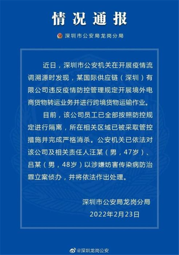 中新網2月23日電 據“深圳龍崗公安”微博消息,深圳公安局龍崗分局23日發布情況通報稱,一家國際供應鏈公司違反疫情防控管理規定開展境外電商貨物轉運業務并進行跨境貨物運輸作業,公安機關對該公司兩名相關負責人以涉嫌妨害傳染病防治罪立案偵辦。具體通報如下: